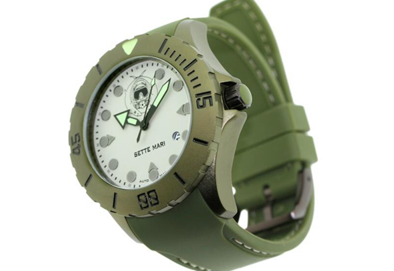 The collection of divers’ watches are called Sette Mari (Italian for seven seas). They have 49mm aluminium ceramic coated cases with automatic movements, said to be Seagull Chinese-made automatic with 25 jewels.