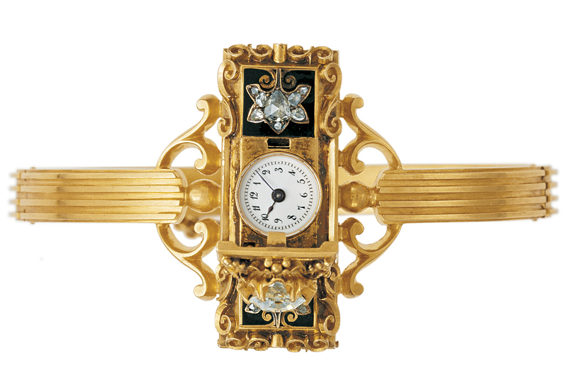 The collection will include Antoine Norbert de Patek’s watch; the Patek Philippe Duke de Regla, a minute repeating pocket watch with Petite Sonnerie and Westminster Chime on five bells; the first Swiss wristwatch made by Patek Philippe in 1868 (pictured), sold to a Countess of Hungary and a 1830 tableclock in the shape of a cage with five singing-birds and music.